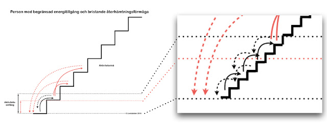 Människor med fungerande återhämtning och normal energinivå kan ta större kliv på trappan, eftersom de har utrymme att ha stora variationer i sin aktivitetsnivå under en och samma dag. Men om jag tvingas gå i normens trappa blir trappstegen på tok för höga. Jag måste hitta sätt att göra stegen mycket mindre, dela upp aktiviteten eller göra den på ett helt annat sätt för att i förläggningen kunna att öka min aktivitetsnivå. För att hitta variation mellan ökad och minskad belastning. Få lite flyt utan ständiga nederlag där jag tappar takten. Att ha ett utrymme för att kunna backa i tid för att häva ett bakslag istället för att alltid okontrollerat slungas nedför trappan av överbelastningssymtomen.