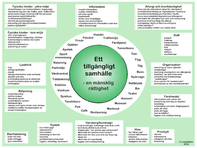 Detta inlägg är helt och hållet skrivet utifrån det jag själv och andra personer med funktionsnedsättningar (och i vissa fall deras anhöriga) upplever som otillgängligt i samhället. Saker och situationer som förhindrar oss att vara delaktiga på det sätt vi vill och behöver. Situationer där vi känner oss diskriminerade. Omfattningen av begreppet tillgänglighet i denna text är vidare än det som omfattas av lagstiftningen. Vissa saker som känns självklara för mig är undantaget i lagen. Just nu är jag inte tillräckligt påläst för att fullt ut kunna redogöra för detta men jag hoppas på ett inlägg längre fram om lagar och regler kring tillgänglighet och diskriminering.