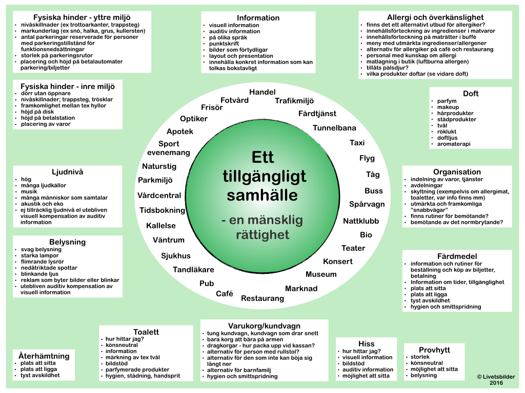 Detta inlägg är helt och hållet skrivet utifrån det jag själv och andra personer med funktionsnedsättningar (och i vissa fall deras anhöriga) upplever som otillgängligt i samhället. Saker och situationer som förhindrar oss att vara delaktiga på det sätt vi vill och behöver. Situationer där vi känner oss diskriminerade. Omfattningen av begreppet tillgänglighet i denna text är vidare än det som omfattas av lagstiftningen. Vissa saker som känns självklara för mig är undantaget i lagen. Just nu är jag inte tillräckligt påläst för att fullt ut kunna redogöra för detta men jag hoppas på ett inlägg längre fram om lagar och regler kring tillgänglighet och diskriminering.