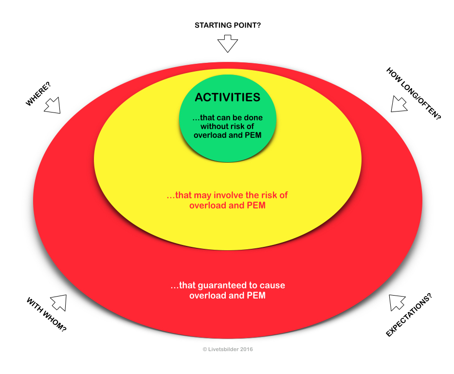 In order to avoid overload and PEM you have to stick to activities in the green circle, avoid activities in the red circle and constantly strive to balance the activities of the yellow circle, so that they end up in the green, and not in the red. This balancing act is called pacing.