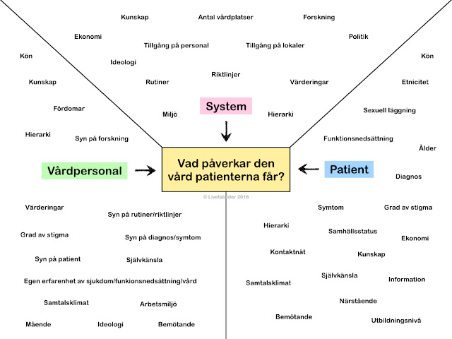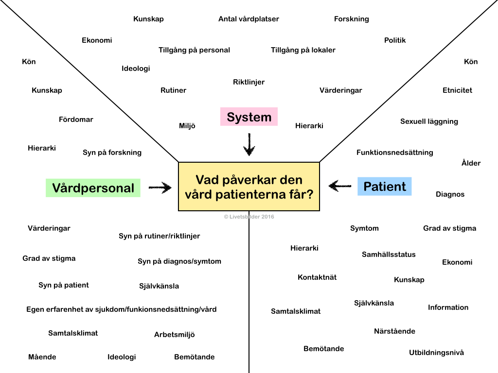 Syntolkning:En bild med exempel på vilka faktorer som kan påverka patienternas vård. Faktorerna är uppdelade på tre grupper; System, Vårdpersonal och Patient. Under rubriken System finns följande faktorer; Kunskap, Antal vårdplatser, Forskning, Ekonomi, Tillgång på personal/lokaler, Ideologi, Rutiner, Riktlinjer, Värderingar, Miljö, Hierarki. Under rubriken Vårdpersonal finns följande faktorer; Kön, Kunskap, Fördomar, Hierarki, Syn på forskning, Värderingar, Syn på rutiner/riktlinjer, Grad av stigma, Syn på diagnos/symtom, Syn på patient, Självkänsla, Samtalsklimat, Arbetsmiljö, Ideologi, Mående, Bemötande, Egen erfarenhet av sjukdom/funktionsnedsättning/vård. Under rubriken Patient finns följande faktorer; Kön, Etnicitet, Sexuell läggning, Funktionsnedsättning, Ålder, Diagnos, Symtom. Grad av stigma, Hierarki, Samhällsstatus. Ekonomi, Kontaktnät, Kunskap, Självkänsla, Samtalsklimat, Information, Närstående, Bemötande, Utbildningsnivå.