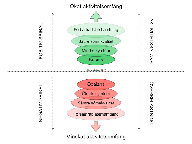 För – om jag inte hela tiden pressar mina gränser krävs inte lika lång återhämtningstid. Konsekvenserna av överbelastning är bland annat sämre sömn och kraftigare symtom vilket kräver en massa energi bara det, liksom en massa känslor av skam och skuld. Balans däremot minskar överbelastning vilket ger mindre symtom och bättre sömn vilket i sin tur ökar kvalitén på återhämtningen.