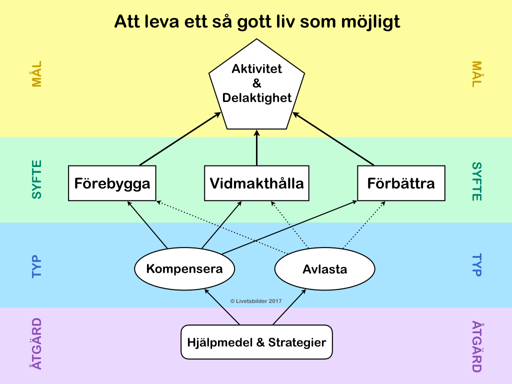”Främja förmåga till aktivitet och delaktighet. Förebygga risk för nedsatt förmåga till aktivitet och delaktighet. Förbättra eller vidmakthålla förmåga till aktivitet och delaktighet. Och. Kompensera för nedsatt förmåga till aktivitet och delaktighet.”