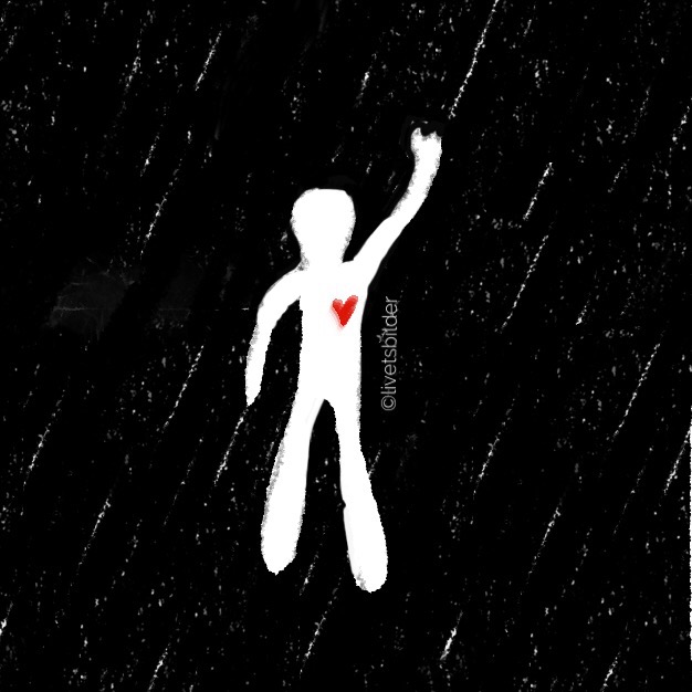 ST: En vit tecknad person med synligt hjärta på en svart bakgrund.