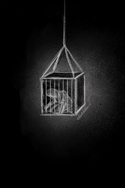 | ST: En människa instängd i en liten bur som är upphängd i ett mörkt rum. |