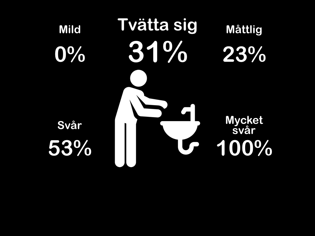 För de med mild ME går det bra, ingen av dom uppger att aktiviteten utlöser PEM. För de med måttlig ME är det 23% som uppger att aktiviteten tvätta sig utlöser PEM. Hos de med svår ME är aktiviteten tvätta sig tillräcklig för att utlösa PEM för 53%. Och för dom med mycket svår ME så är det 100% som får PEM.