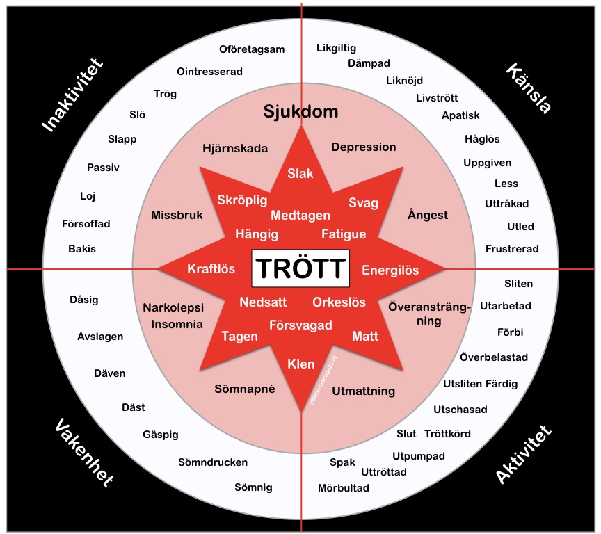 Syntolkning: Bilden består av en cirkel med olika lager. I mitten står ordet TRÖTT. Cirkeln är också uppdelad i fjärdedelar och markerade med kategorinamnen Inaktivitet, Känsla, Aktivitet och Vakenhet. Det yttre lagret innehåller en mängd synonymer till trött som alla människor upplever mer eller mindre i ”normalt” tillstånd. Mellanlagret är sjukdomar och tillstånd relaterade till de olika kategorierna. Den innersta stjärnformade lagret innehåller synonymer till ordet trött som relaterar till sjukdom.