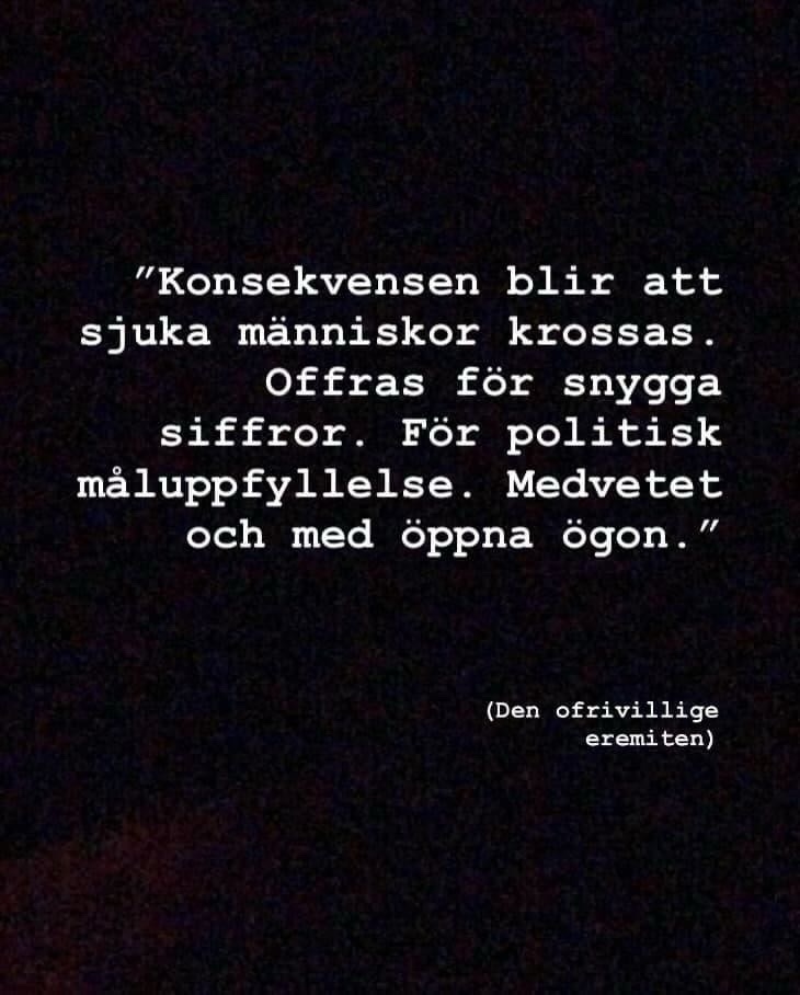 Konsekvensen blir att sjuka människor krossas. Offras för snygga siffror. För politisk måluppfyllelse. Medvetet och med öppna ögon.