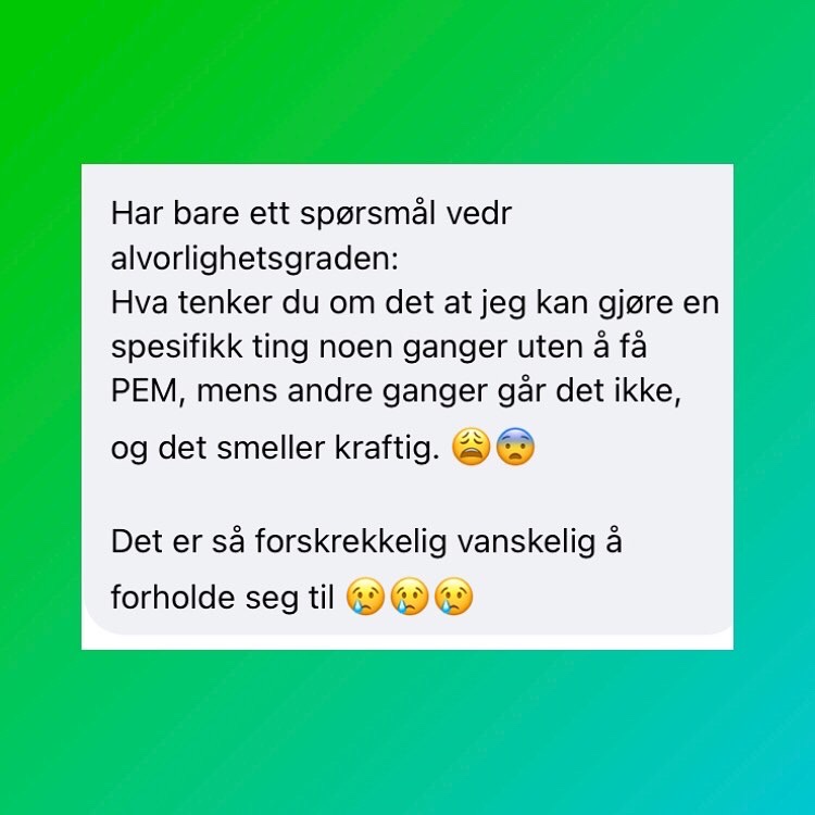 Arbetsterapeuten i mig tänker så här: Även om aktiviteten är densamma kan förutsättningarna runt den skifta och därmed påverka risken för PEM. Därför kan det krävas ganska mycket detektivarbete för att förstå utfallet, vilket man inte alltid har kapacitet till på grund av sjukdomen.