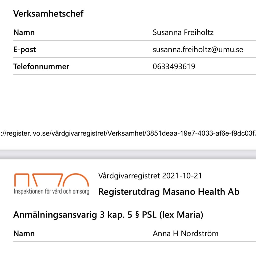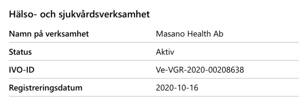 2020-10-16, ett helt år innan fokusgruppen startade registrerades Masano Health AB som vårdgivare i IVOs vårdgivarregister (bild 3). Susanna Freiholtz står som verksamhetschef och ansvarig för anmälningar (tex lex Maria) är Anna Nordström (bild 4, datumet som syns i mitten av bilden är dagen jag begärde ut handlingen). Detta var ett drygt halvår innan regionen och Masano sökte pengar från Vinnova och långt innan Anna presenterades som aktuell läkare för ME-mottagningen, ungefär vid tiden för att den andra utredaren la fram sin rapport men inga slutgiltiga beslut var ännu tagna.
