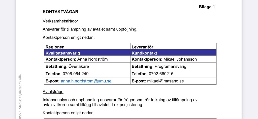 Anna Nordström finns med på den uppköpande sidan, dvs region Västerbotten, som avtalsägare (bild 9) och kvalitetsansvarig (bild 10). Som jag förstår det är avtalsägare den som är ytterst ansvarig för ett avtal. Susanna Freiholtz finns med på motsatt sida, hos leverantören Masano Health AB som avtalskontakt (bild 11).
