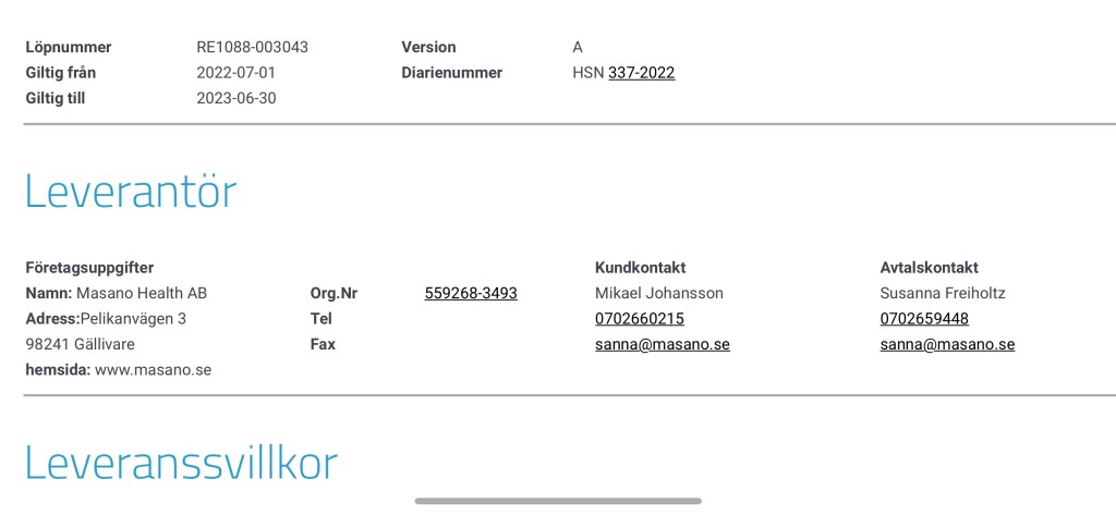 Till själva avtalet hör ett antal bilagor som styr vad Masano Health AB ska leverera. Dessa består dels av den projektbeskrivning som jag tidigare fått ut i ett kraftigt sekretessbelagd via Vinnova och som alltså upprättades i samband med att finansiering söktes tidigt under våren 2021 och dels ett dokument som beskriver den digitala rehabiliteringen (oklart när detta dokument upprättats). Så det Masano åtagit sig att leverera är samma sak de levererat under vården.