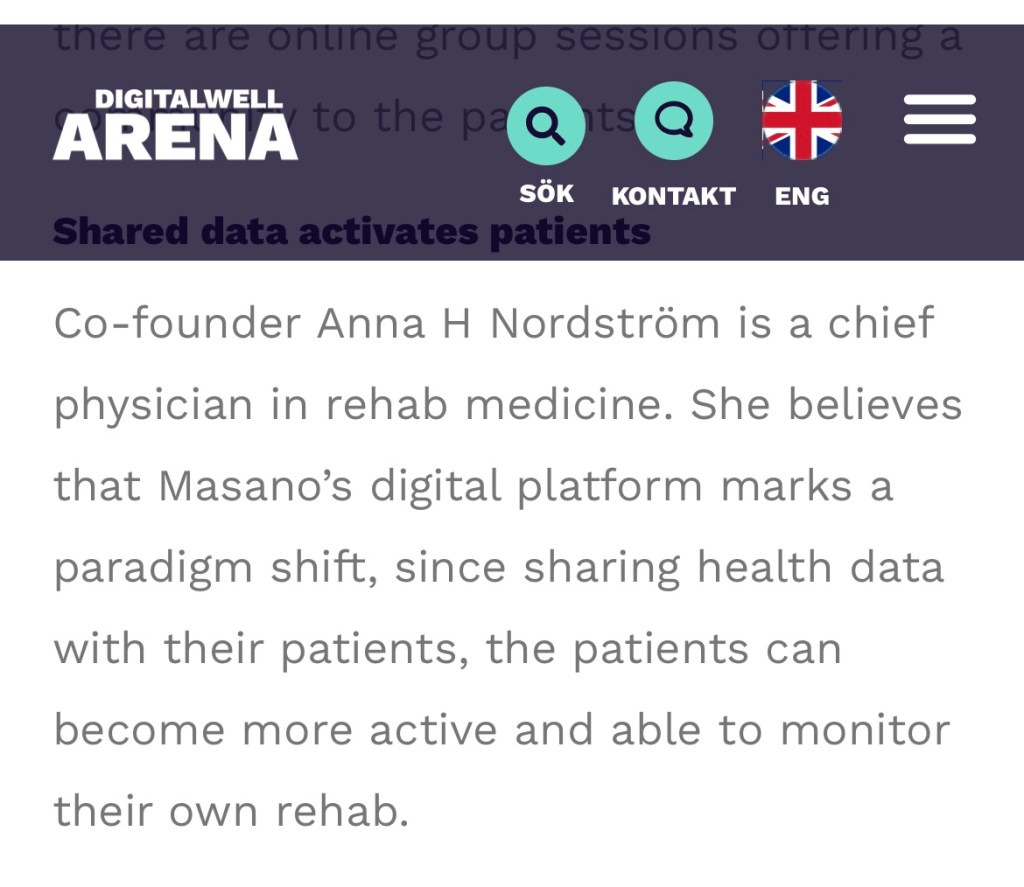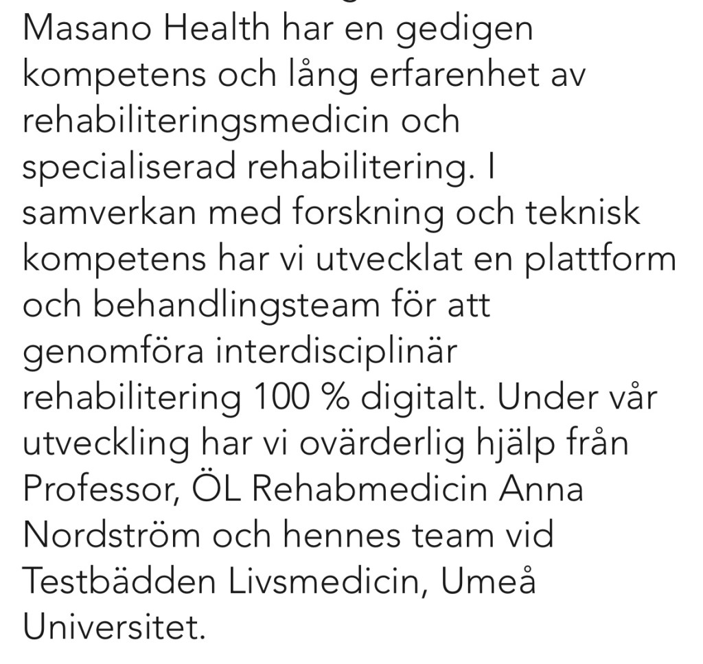 Så ME-mottagningen i Västerbotten som hela tiden utåt hävdat att rehabilitering inte ligger inom ramen för deras uppdrag har bakom kulisserna planerat att testa digital rehabilitering på sina patienter från dag ett. Faktum är att planerna troligen fanns redan innan det slutgiltiga politiska beslutet om budget för ME-mottagningen klubbades i mars 2021. Ansökningarna om Vinnovamedel skulle nämligen in mellan den sista mars och 11 maj 2021 och då hade Masano Health enligt projektbeskrivningen redan en färdig lösning att sjösätta. Sånt kräver tid. Via företagets hemsida kan vi utläsa att Anna Nordström varit rådgivare under uppbyggnaden (bild 1) av deras program redan i sitt arbete på Livsmedicin. Samma Norström dyker sedan under 2021 upp som överläkare på ME-mottagningen (bild 2).