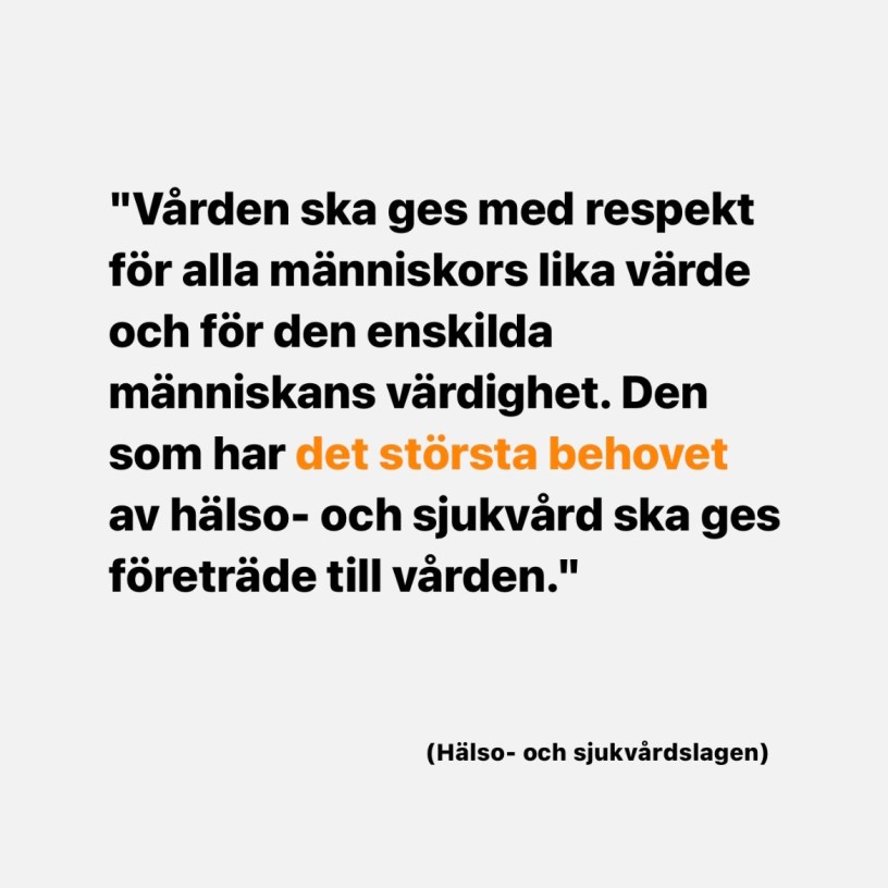”Vården ska ges med respekt för alla människors lika värde och för den enskilda människans värdighet. Den som har det största behovet av hälso- och sjukvård ska ges företräde till vården.” (Hälso- och sjukvårdslagen)