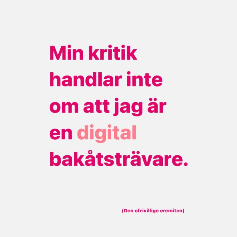 Innan jag fortsätter måste jag berätta att jag använder digitala lösningar varje dag. Så jag är ingen digitaliseringsmotståndare alls. Ett väldigt konkret exempel är mitt skrivande. Inga av mina texter hade nått er om jag hade tvingats sitta upp och skriva för hand eller på en skrivmaskin. Inte ens om jag hade haft tillgång till en stationär dator. Förutsättningen för att jag ska kunna skriva och ni ska kunna ta del av det jag skriver är rätt och slätt att jag kan ligga på rygg i sängen och skriva på min telefon. Att jag får skriva i min takt, i det format som blir och om det som engagerar mig.