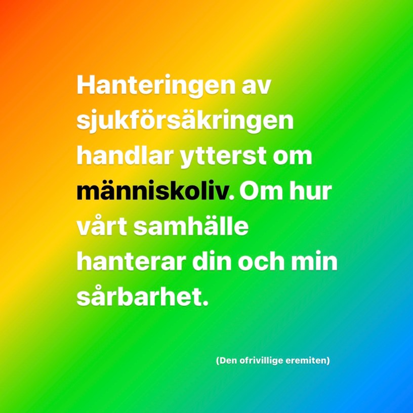 Hanteringen av sjukförsäkringen handlar egentligen inte om politisk riktning. Om vem som ska vinna ett val. För inget av det här var bra. Inget av det var värdigt. Och inget av det är något som ska förekomma i välfärdsstaten Sverige.