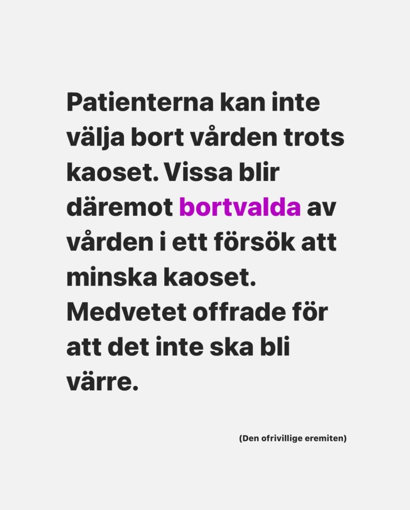 Patienterna kan inte välja bort vården trots kaoset. Vissa blir däremot bortvalda av vården i ett försök att minska kaoset. Medvetet offrade för att det inte ska bli värre. Ändå handlar alla artiklar om läkarna och deras arbetsmiljö.