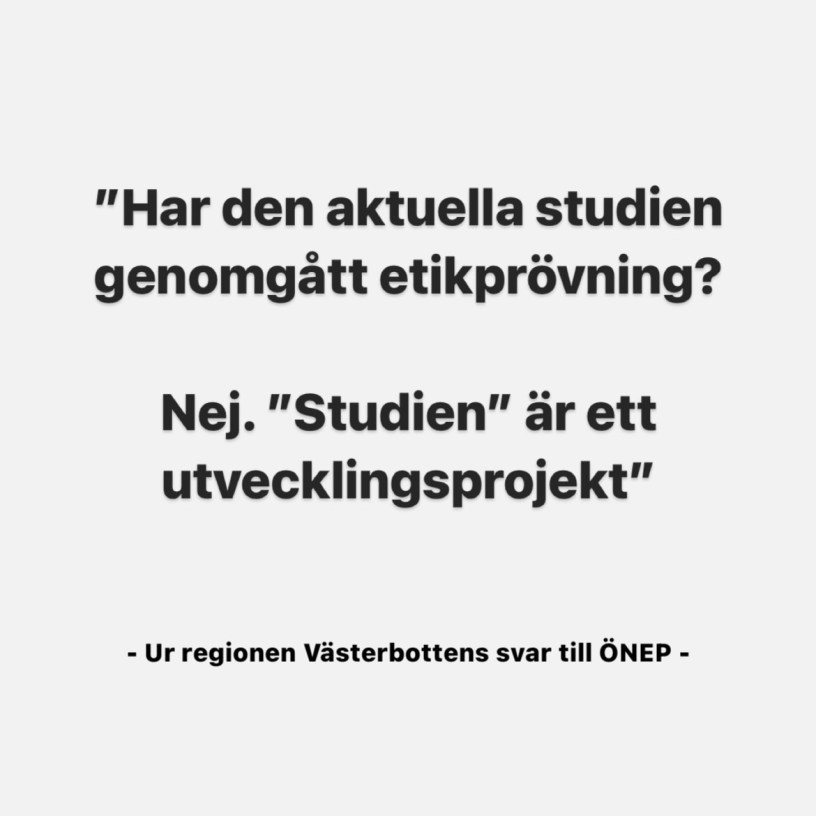 ”Regionen kan utifrån projektansökan till Vinnova-utlysningen konstatera att det finns vetenskaplig frågeställning och metod och att projektet utförs av personer med vetenskaplig kompetens. Det har inte gått att finna att resultaten skulle vara publicerade eller att publicering planeras i en vetenskaplig tidskrift. Däremot är planen att sprida kunskap om projektresultat till andra regioner och sätta upp liknande behandlingsupplägg på flera ställen i Sverige. Mot bakgrund av detta handlar det inte om kunskap som byggs enbart för region Västerbottens räkning (i o m att ett företag är involverat så är det ju också i deras ekonomiska intressen att nå fler kunder) – ej heller är projektet relaterat till högskoleutbildning (vilket skulle kunna utgöra ett undantag för tik prövning). I o m att de två förstnämnda kriterierna uppfylls och att forskning enligt Helsingforsdeklarationen behöver publiceras så är bedömningen att den tredje villkoret uppfylls. Avvägningen är svår att göra, företaget som regionen avtalat tjänsten med är anmälda till vårdgivareregistret och är att betrakta som vårdgivare, det sägs även att företagets plattform är ”evidensbaserad” samtidigt som effekten av behandlingen behöver utvärderas samt att projektet är ett sk. innovationprojekt. Regionen har utifrån de fynd som uppmärksammats i projektet valt att pausa projektet till dess att ÖNEP har fattat beslut i frågan.”