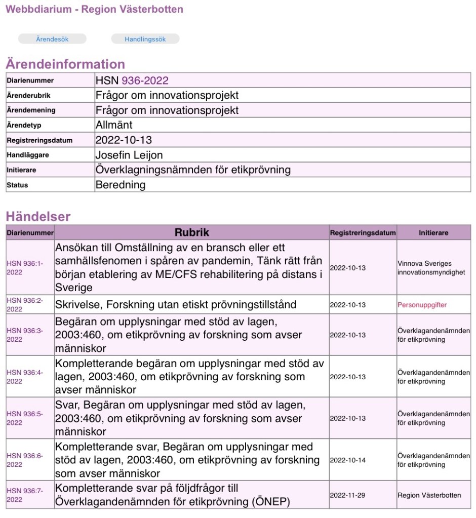 Den första handlingen är daterad 2021-05-11 och innehåller ansökan till Vinnova för samarbetsprojektet ” Tänk rätt från början”, projektbeskrivningen samt en CV för nyckelpersoner i projektet. Den andra är tipset som inkommer till ÖNEP den 16/5 i år. Den tredje är ÖNEPs första begäran om upplysningar som skickas till verksamhetschefen för ME-mottagningen den 17 juni. Den fjärde är en kompletterande begäran om upplysningar som ÖNEP skickar till verksamhetschefen och en avdelningschef den 28/9. Därefter, den 13/10, skickas två handlingar till ÖNEP: Ett svar från verksamhetschefen till ÖNEP och en skrivelse från regionens FoU-stab. Nyligen, den 23/11 skickades ett kompletterande svar från projektansvarig forskare i samarbete med Geriatriskt centrums FoU-ansvarige via verksamhetschefen till ÖNEP.