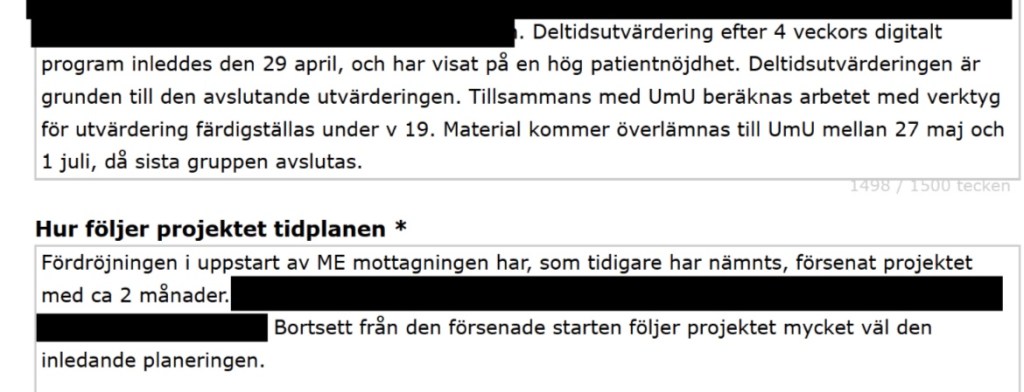 ”Fördröjningen i uppstart av ME mottagningen har, som tidigare har nämnts, försenat projektet med ca 2 månader./…/Bortsett från den försenade starten följer projektet mycket väl den inledande planeringen.”