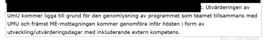 ”Utvärderingen av UmU kommer ligga till grund för den genomlysning av programmet som teamet tillsammans med UmU och främst ME-mottagningen kommer genomföra inför hösten i form av utveckling/utvärderingsdagar med inkluderade extern kompetens.”