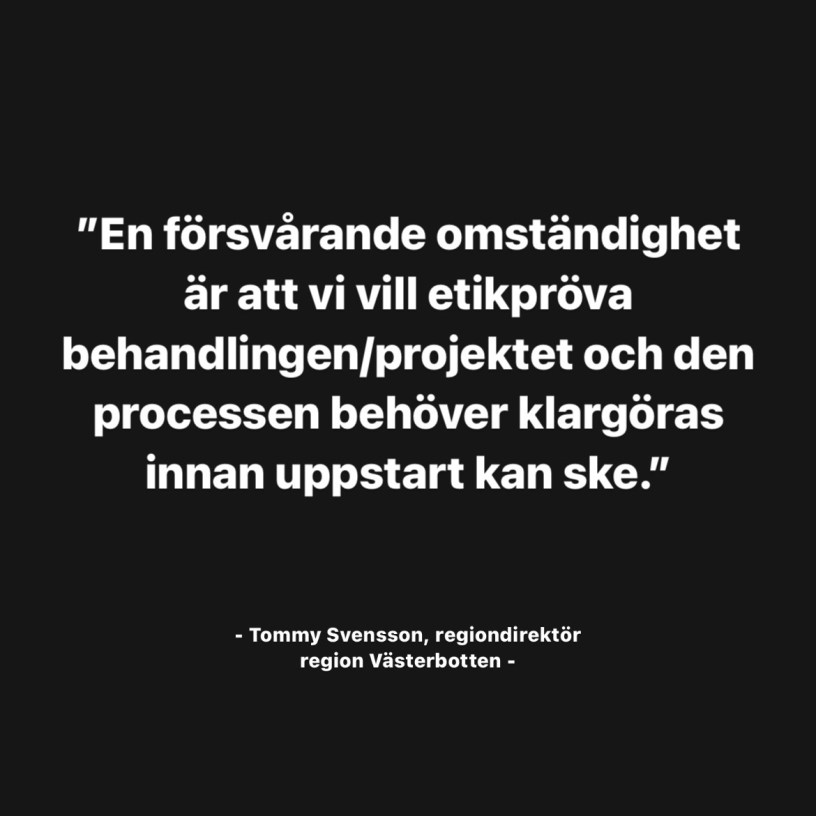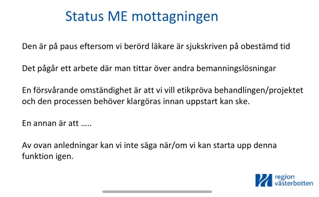”Den omdiskuterade ME-mottagningen i Umeå sattes på paus i slutet av oktober på grund av personalbrist. Den läkare som har arbetat där är sjukskriven. Regiondirektören Tommy Svensson beskriver det dessutom som en försvårande omständighet att regionen vill etikpröva behandlingen, eller ett projektet som pågått, men den processen behöver klargöras innan en uppstart kan ske. Regionens revisorer har nu fått uppgifter om eventuella oegentligheter som gäller två personer vid ME-mottagningen och det är dessa revisorerna nu börjat att utreda. Enligt dem ska de båda anställda också har varit initiativtagare och delaktiga när en digital rehabiliteringstjänst togs fram. Det här innebär att det är svårt att starta ME-verksamheten igen innan de här frågorna är klargjorda. – Det är lite svårt att säga när vi kan komma i gång, säger Svensson.”