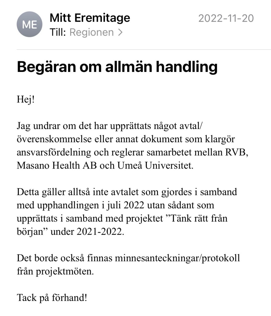 Det började redan i november. Jag mejlade regionen med en begäran om att få ta del av eventuellt avtal/överenskommelse eller annat dokument som klargör ansvarsfördelning och reglerar samarbetet mellan region Västerbotten, Masano Health AB och Umeå Universitet i projektet Tänk rätt från början. Jag bad även om protokoll från möten.