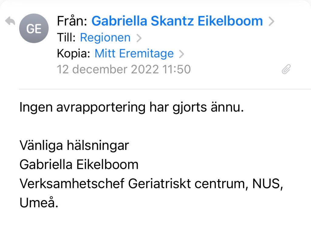 Efter en månads mejlade fram och tillbaka konstaterade regionen att det inte fanns några sådana handlingar. Inget avtal fanns registrerat i diariet. Bakåt i mejlkonversationen går det se att regionjuristerna har sagt till registratorn att det åtminstone borde finnas någon form av rapporter till Vinnova men verksamhetschefen på ME-mottagningen hävdade att ingen avrapportering hade gjorts ännu.