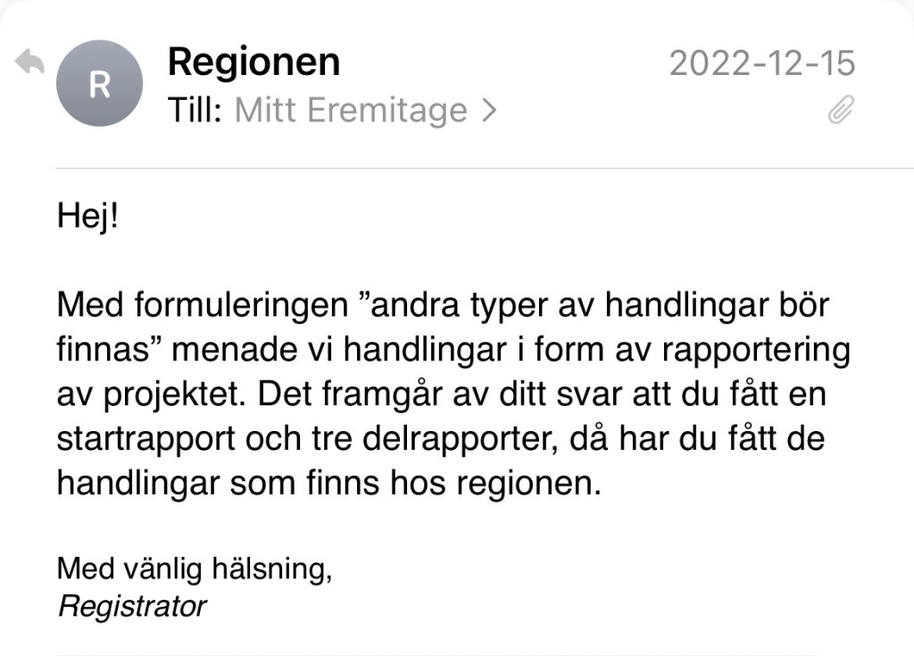 Eftersom jag redan tidigt i höstas begärde ut dokument gällande projektet från Vinnova hade jag dock en startrapport och tre lägesrapporter i min ägo. Jag berättar detta för registratorn och hen avslutar kommunikationen med att konstatera att om jag redan hade dessa rapporter har jag de handlingar som finns hos regionen.