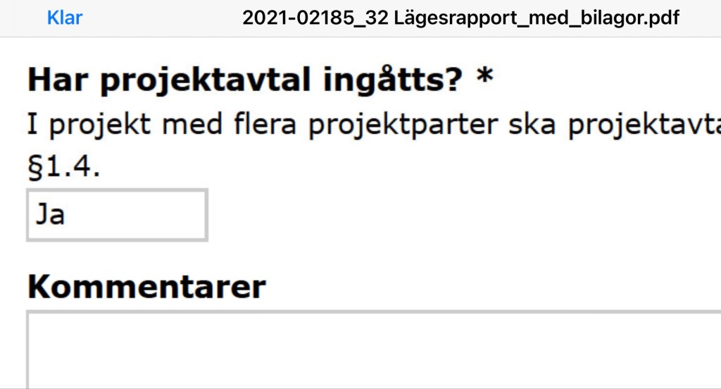 Över jul och nyår när regionens arbete gick på lågvarv drog jag mig till minnes att jag faktiskt hade läst något i rapporterna till Vinnova som hade något med ett avtal att göra. Och mycket riktigt. När jag gick igenom lägesrapporterna på nytt kunde jag konstatera att det i en av dem som är inskickad till Vinnova 2022-03-25 framgår att ett sådant avtal har ingåtts. I den tidigare lägesrapporten som skickades in 2021-11-19 står det att detta avtal är under upparbetade. För lägesrapporterna ansvarar projektets koordinator och det är projektledaren, tillika överläkaren på ME-mottagningen, som skickat in dem.
