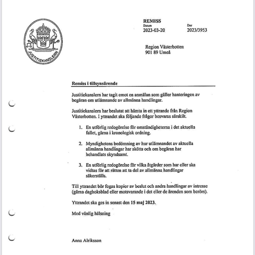 Idag begärde jag ut handlingarna (diarienummer HSN 297-2023) om att region Västerbotten begärt förlängd svarstid på Justitiekanslerns begäran om yttrande gällande hanteringen av utlämnandet av allmänna handlingar.