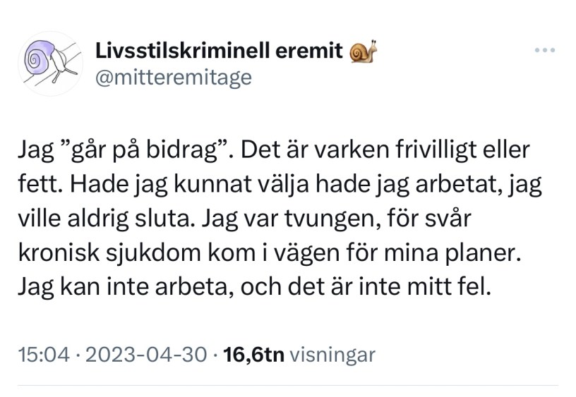 ”Jag ”går på bidrag”. Det är varken frivilligt eller fett. Hade jag kunnat välja hade jag arbetat, jag ville aldrig sluta. Jag var tvungen, för svår kronisk sjukdom kom i vägen för mina planer. Jag kan inte arbeta, och det är inte mitt fel.”