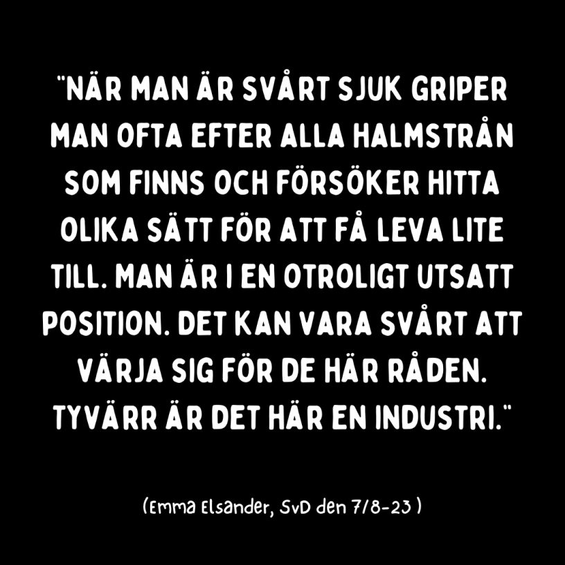 ”När man är svårt sjuk griper man ofta efter alla halmstrån som finns och försöker hitta olika sätt för att få leva lite till. Man är i en otroligt utsatt position. Det kan vara svårt att värja sig för de här råden. Tyvärr är det här en industri.”