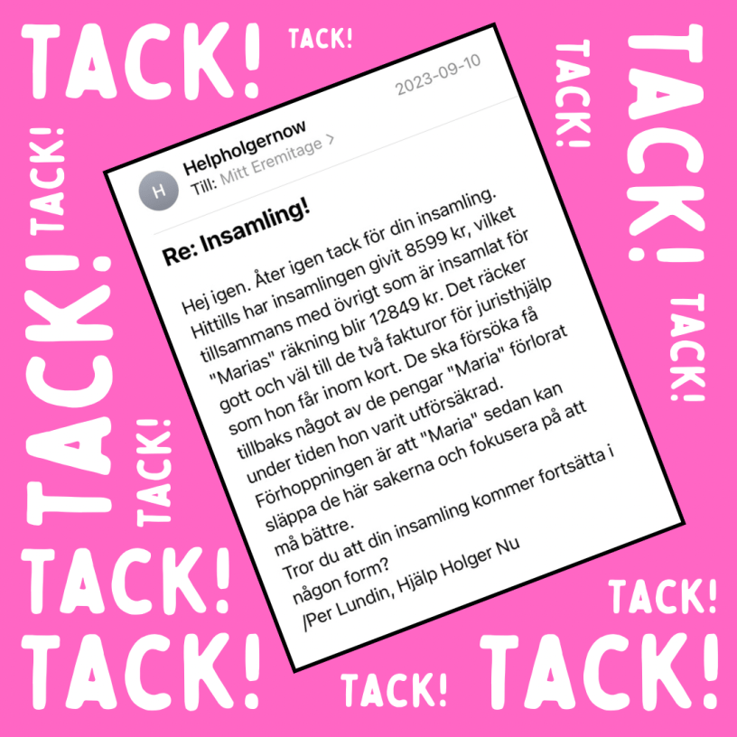 Vi lyckades tillsammans samla in 8599 kronor via Swish och vinsten från min shop som har gått till Help Holger Now:s insamling till ME-sjuka Marias juristkostnader!