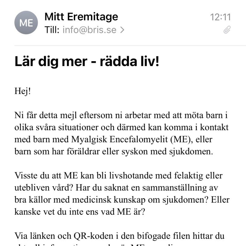 Jag har mejlat olika stödlinjer och tagit hjälp av den brevmall jag tagit fram och som finns på sidan där flygbladet går att ladda ner. Jag tänker att det är viktigt att instanser som möter människor som mår dåligt och kanske är i kris förstår vad ME är för sjukdom och vilka konsekvenser den får.