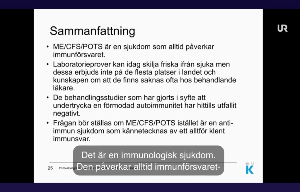 ”För att sammanfatta: Postvirala besvär är inte nya, men vi har i dag helt fantastiska möjligheter att diagnostisera och behandla dem tack vare teknikutvecklingen.Den nuvarande svenska sjukvårdsorganisationen är dåligt utrustad för utredning och behandling av okända diagnoser. Vi vet i dag väldigt lite om hur stor andel av alla med symtomdiagnoser – ME men även utmattningssyndrom, fibromyalgi etcetera – som lider av en paraviral sjukdom. Vi letar ju inte aktivt efter sådan.” (Länk till en transkribering av föreläsningen, s 19 https://data.riksdagen.se/dokument/H80WRFR16 )