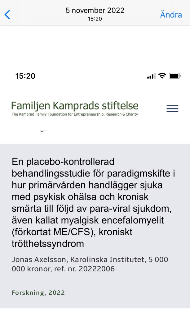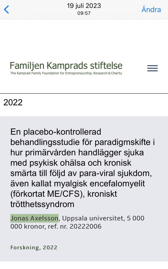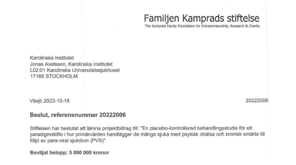 ”Som du kanske vet har jag fått 5 MSEK i stöd från familjen Kamprads stiftelse för att genomföra en blindad klinisk studie av antiviral behandling (det sedan länge godkända läkemedlet valganciclovir) hos utvalda patienter med vad jag kallar post-viralt-trötthetssyndrom. Studien skulle ligga på klinisk immunologi på KS och OH är beräknad utifrån detta (15%). Tyvärr har nu både Klinisk immunologi, Akademiskt specialistcentrum och Akademiskt primärvårdscentrum inom Region Stockholm tackat nej till att vara medelsförvaltare för den ”kontroversiella” studien.” (E-post Axelsson, 2023-01-04)