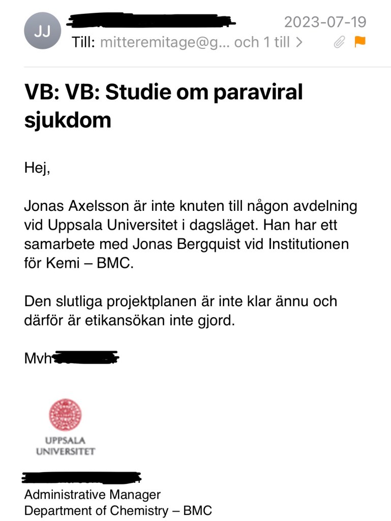 Jag kontaktar då UU och begär att få ta del av eventuell etikprövning eller forskningsprotokoll för studien samt frågar vid vilken avdelning Axelsson är anställd. Jag får till svar att Axelsson inte är knuten till någon avdelning på UU ”i dagsläget” men att han har ett samarbete med Jonas Bergquist vid Institutionen för Kemi (BMC). De meddelar också att det inte finns någon färdig projektplan än och därför inte heller någon ansökan till Etikprövningsmyndigheten.