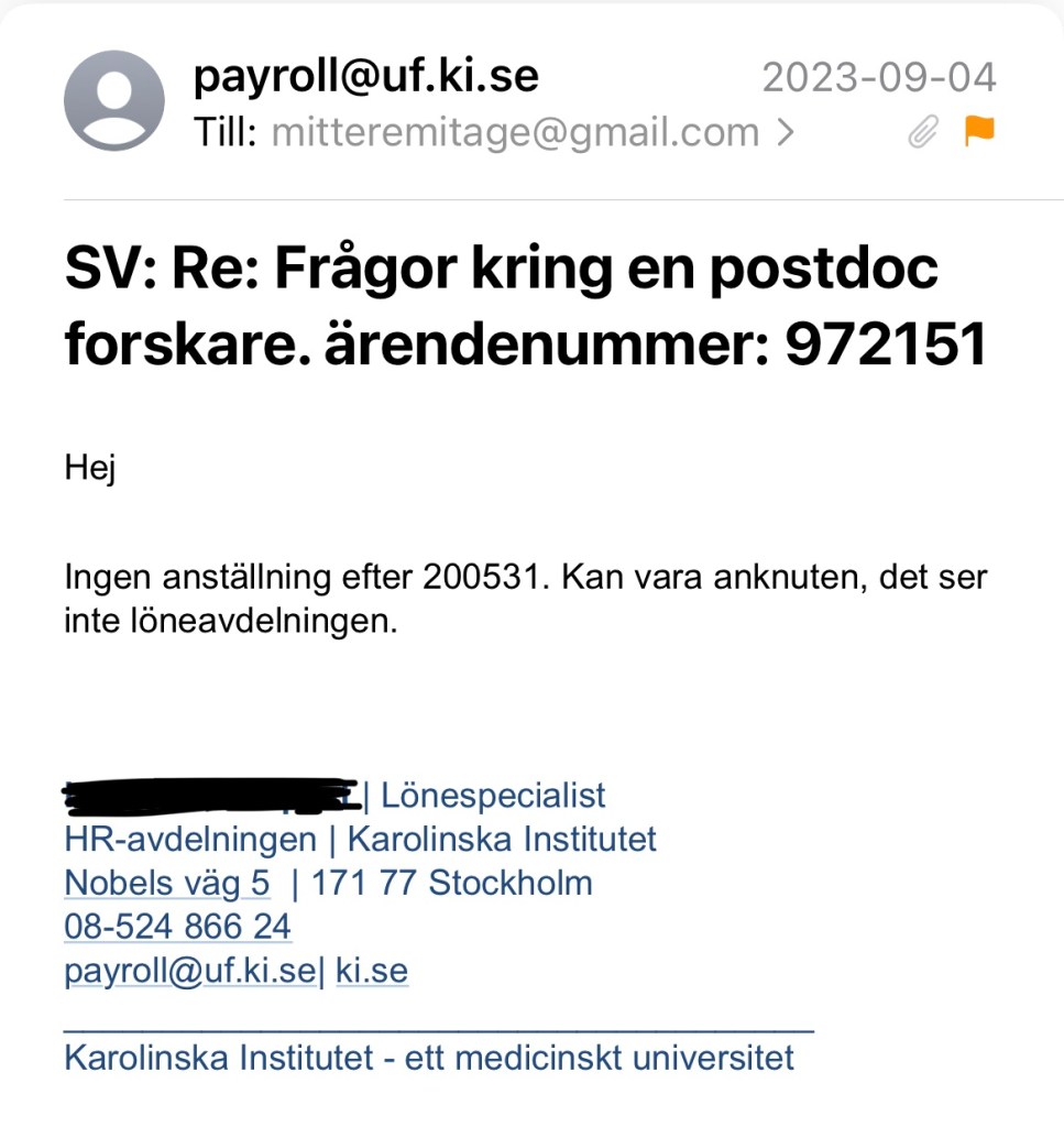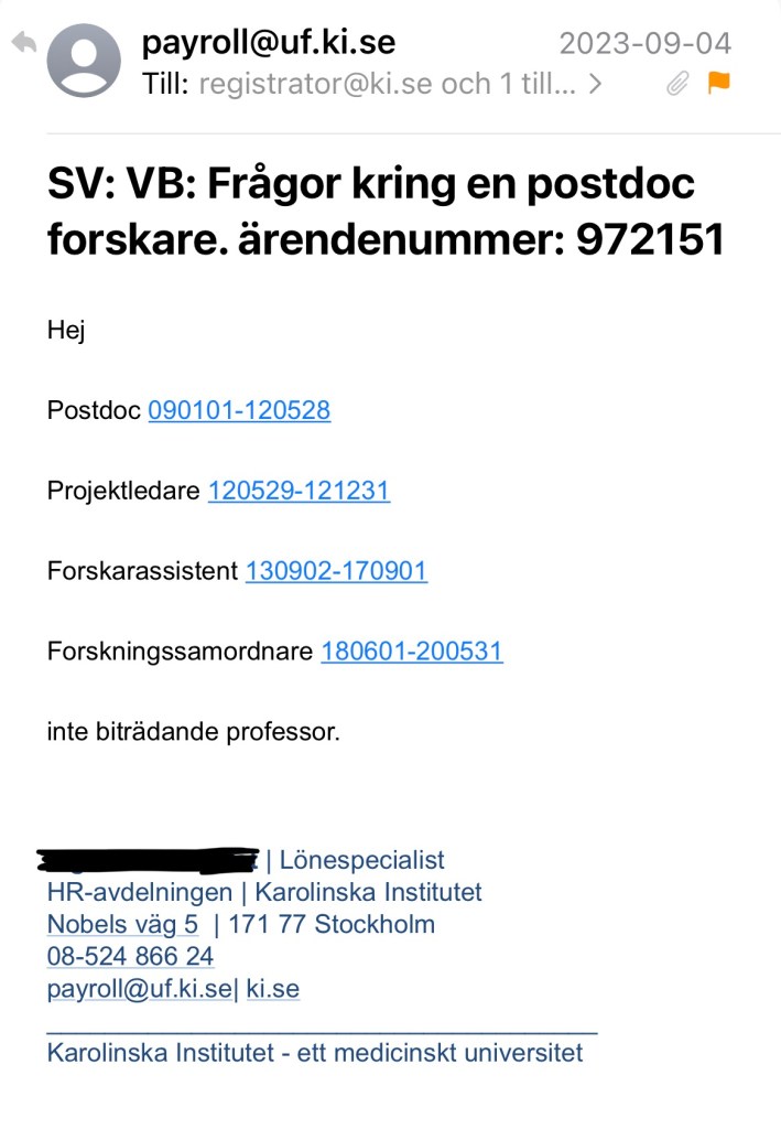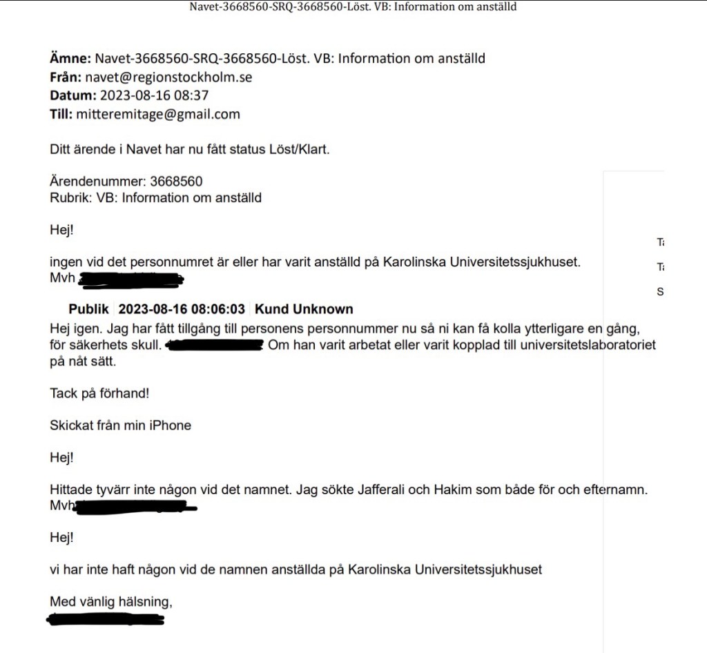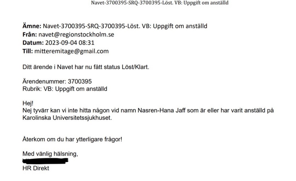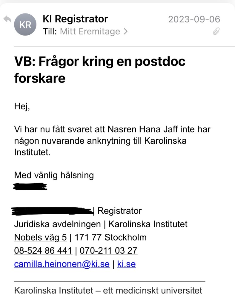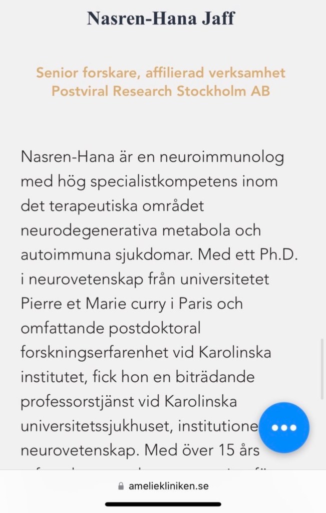 Jag tänker att det skulle kunna ha skett en sammanblandning med KI och kontaktar därför deras registrator. Det visar sig då att Jaff varit anställd hos dem vid Institutionen för klinisk neurovetenskap, men inte som biträdande professor. Däremot har hon haft anställning som postdoc, projektledare, forskarassistent och forskningssamordnare. Den senaste anställningen som forskningssamordnare upphörde den sista maj 2020 och hon hade i september -23, när presentationen låg på Amelieklinikens hemsida, varken anställning vid eller anknytning till KI.