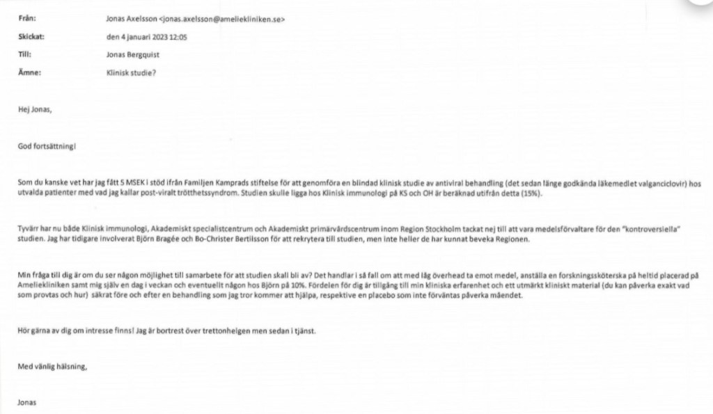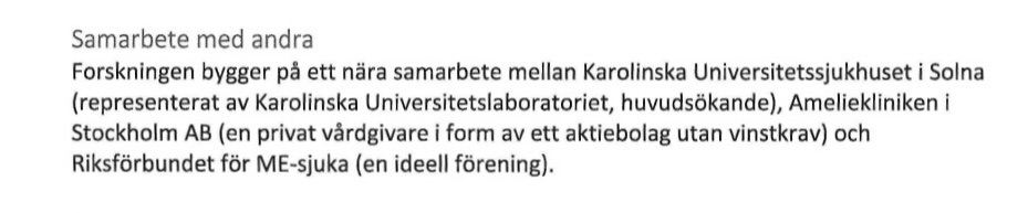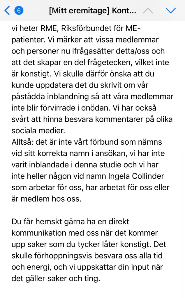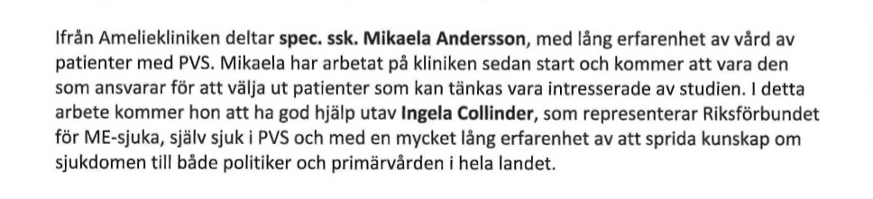 I avsnitt 2 sa jag att det framgick av ansökan att Riksförbundet för ME-patienter (RME) skulle vara samarbetspart i detta projekt och hjälpa till med urvalet av patienter tillsammans med klinikens sjuksköterska Mikaela Andersson. Efter publicering blev jag kontaktad av RMEs kommunikationsutskott som berättade att RME inte är samarbetspart i detta projekt. De påpekar också mycket riktigt att namnet på förbundet i ansökan inte är exakt överensstämmande med deras namn då de heter Riksförbundet för ME-patienter, inte ME-sjuka.