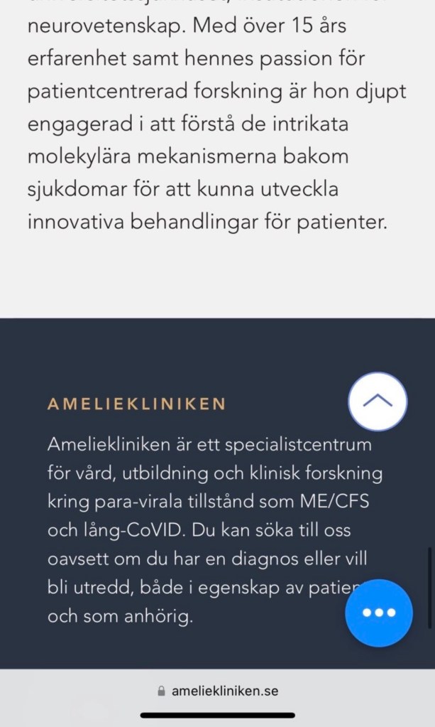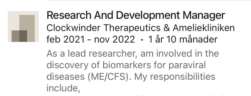 Vid en sökning på namnet tillsammans med Ameliekliniken hittar jag en person vid namn Hakim Jaffer som uppger på Linkedin att han har arbetat på Ameliekliniken fram till november 2022. Bland meriterna framgår att han varit ”involverad i upptäckten av biomarkörer för paravirala sjukdomar (ME/CFS)”.