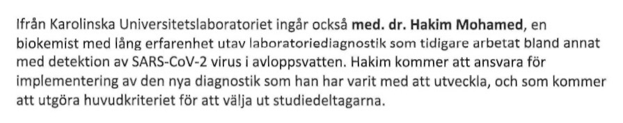 Ytterligare en person med anställning på KUL finns omnämnd i ansökan, en biokemist och med. dr. vid namn Hakim Mohamed. Hans uppgift i projektet specificeras till att implementera diagnosverktyget som han också varit med och utvecklat. Detta benämns som en avgörande del i projektet då verktyget kommer användas för urval av studiedeltagare.
