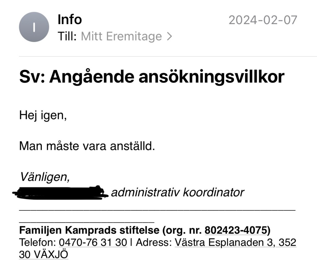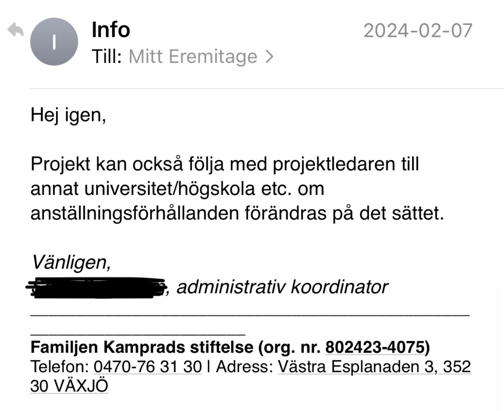 Jag kontaktar stiftelsen för att dubbelkolla att jag tolkat deras villkor för anslag korrekt och vad som skulle hända om anställningsförhållandena ändras så att ingen i ett projekt längre är anställd på det sätt villkoren anger. En administrativ koordinator på stiftelsen bekräftar att min tolkning angående privata företag stämmer. De kan inte ansöka, men vara samarbetspart i projekt. När det gäller ändrade anställningsförhållanden svarar hon så här:
