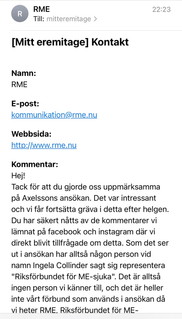 Men om Riksförbundet för ME-patienter inte är inblandade i projektet, vilket förbund menar då Axelsson när han anger att Riksförbundet för ME-sjuka är det? Mig veterligen finns det inget annat riksförbund kopplat till ME än just RME.