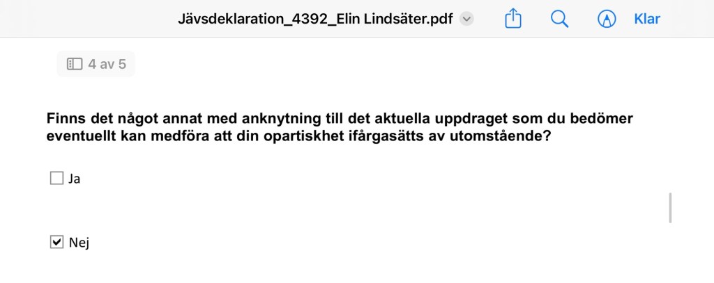 På grund av Lindsäters uttalande engangemang i Oslo Chronic Fatigue Consortium har jag begärt ut jävsdeklarationerna för henne och de andra som varit inblandade i den senaste uppdateringen av vårdprogrammet.