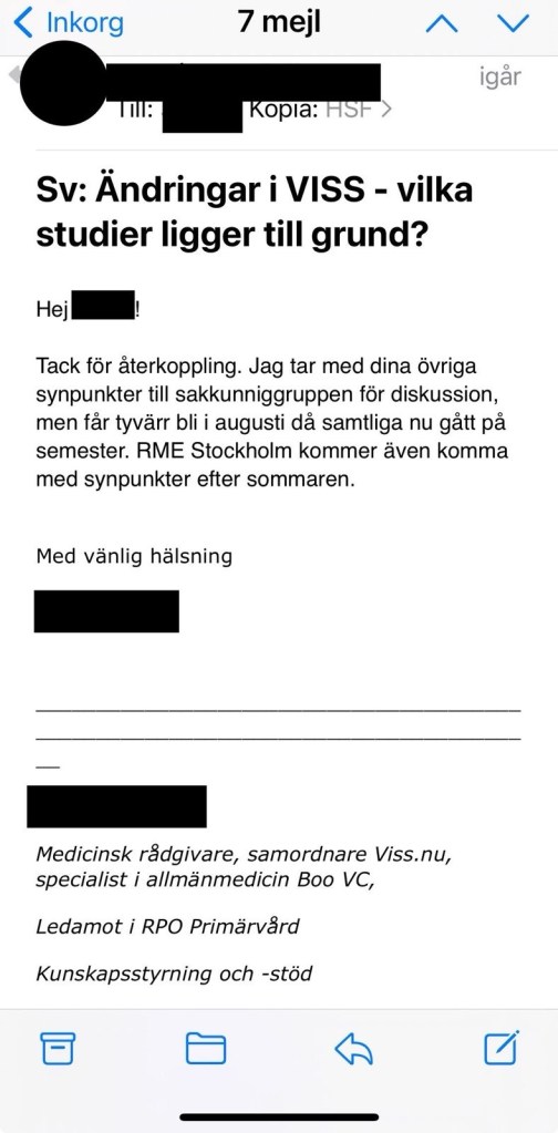 ”Tack för återkoppling. Jag tar med dina övriga synpunkter till sakkunniggruppen för diskussion, men får tyvärr bli i augusti då samtliga nu gått på semester. RME Stockholm kommer även komma med synpunkter efter sommaren.”