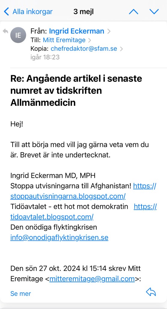Jag fick faktiskt en snabb reaktion igår på mitt mejl gällande den problematiska artikeln i tidskriften Allmänmedicin. Men ansvarig utgivare brydde sig överhuvudtaget inte om att kommentera min kritik utan ifrågasatte istället att jag inte berättat vem jag är.