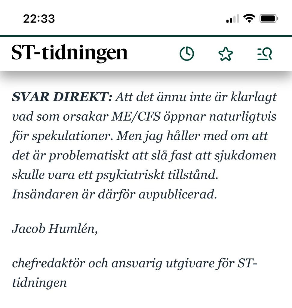”SVAR DIREKT: Att det ännu inte är klarlagt vad som orsakar ME/CFS öppnar naturligtvis för spekulationer. Men jag håller med om att det är problematiskt att slå fast att sjukdomen skulle vara ett psykiatriskt tillstånd. Insändaren är därför avpublicerad. Jacob Humlén, chefredaktör och ansvarig utgivare för ST-tidningen.”