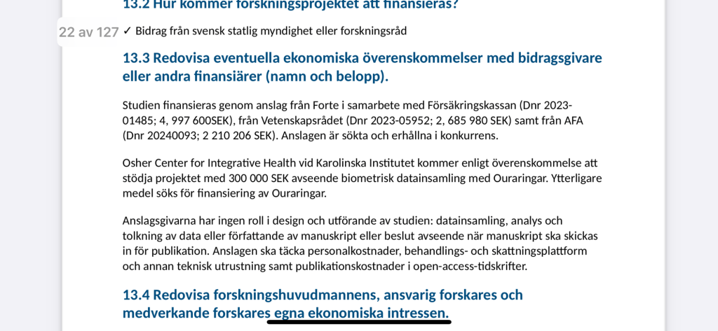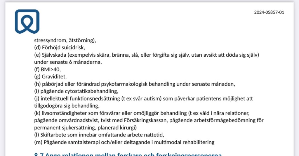 En tragikomisk detalj i hela den här soppan är att Försäkringskassan inte bara är finansiär av studien utan också finna med bland exklusionskriterierna [etikprövningsansökan s. 18]. Om du har en ”tvist med Försäkringskassan” får du nämligen inte delta i studien eftersom det räknas som ”en livsomständighet som försvårar eller omöjliggör behandling”.