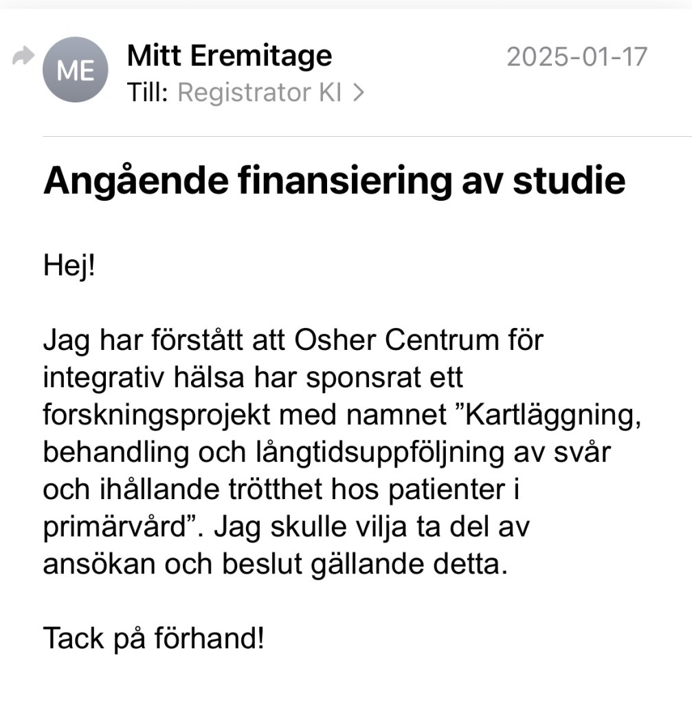 I etikprövningsansökan för Trötthetsstudien från hösten 2024 framkommer att även Osher Centrum vid Karolinska Institutet sponsrar studien med 300 000 kronor: